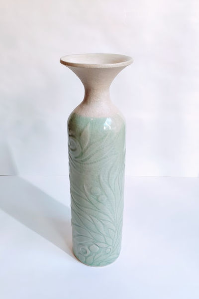 This tall vase is part of a series made over winter, with muted colours that emphasise the texture and quality of the clay. The rough clay used for the body of the vase was coated in several layers of smooth clay that were then carved through to create a pattern that can be seen and felt through the glaze. The naked clay at the top of the neck provides interesting contrast with the glazed surface.